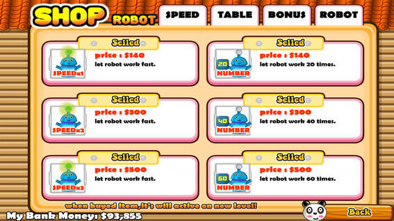 客人来时先安排他们就座,等客人招手时就可以上去点餐了,接下来去吧台将食物拿给相应的客人就可以了,客人走后要记得收钱哦。游戏中有各种不同的道具,赚取足够的金钱后就可以购买不同的道具,装扮你的餐厅了。